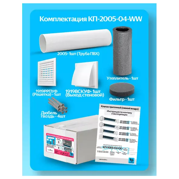 Модель относится к серии КП-04, что означает наличие металлической наружной решётки и регулируемого внутреннего блока. Индекс 2005 указывает на увеличенный диаметр канала (обычно ~125 мм), что обеспечивает более высокий объём приточного воздуха по сравнению с моделями 100 мм.