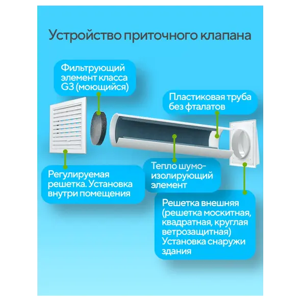 Конструкция представляет собой канал с тепло- и шумоизоляцией, фильтром и регулируемой заслонкой. Воздух поступает естественным образом без использования электричества.